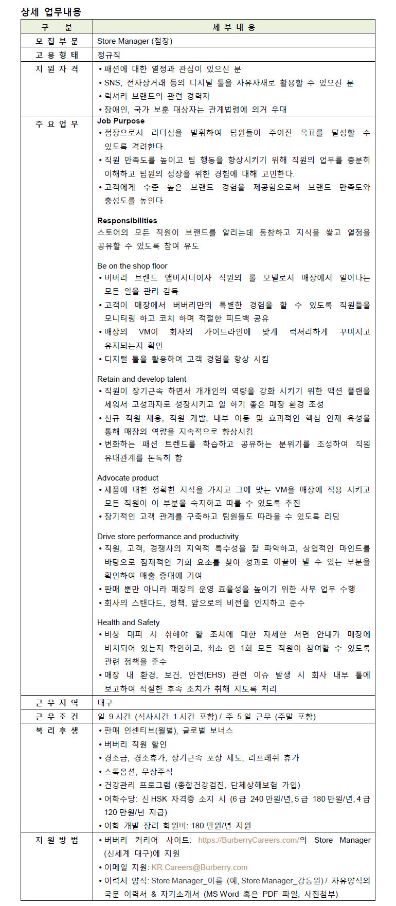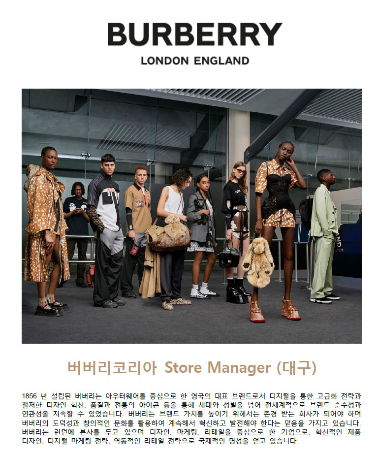 버버리코리아 Store Manager(대구) 채용