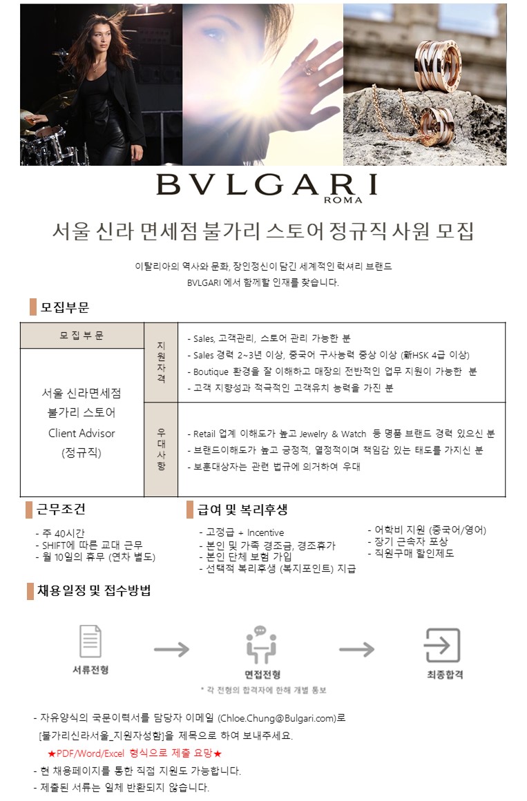 이력서 송부 이메일 주소 : Chloe.Chung@Bulgair.com