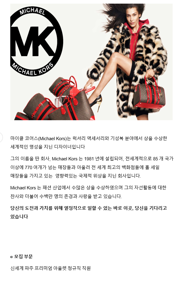 [마이클코어스] 신세계 파주 프리미엄 아울렛 정규직 주니어 모집